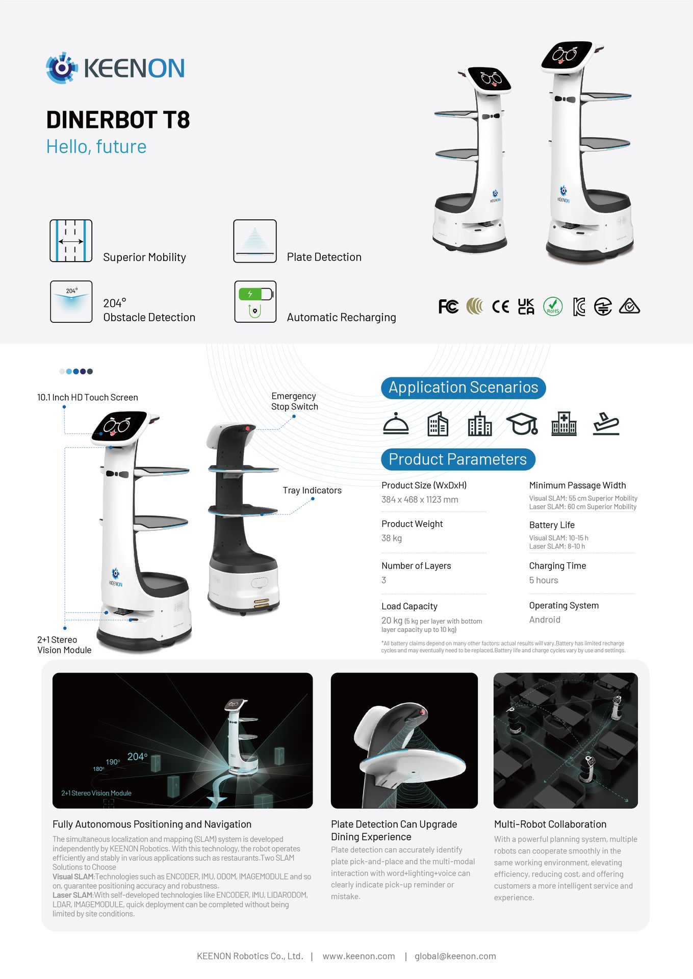 Keenon T8 on erinomaisen kätevä tarjoilurobotti, joka kykenee kulkemaan kapeimmillaan jopa 70 cm käytävästä, Se tunnistaa lastaustasolleen laitettavan tuotteen ja havaitsee itse milloin se on otettu. Se voidaan helposti personoida ravintolan tarpeisiin erilaisilla tarrakiteillä. Robotti voi myös toimia napostelutuotteiden jakajana isommissa tilaisuuksissa, jossa se kiertää ennalta määrättyä reittiä palvellen asiakkaita.